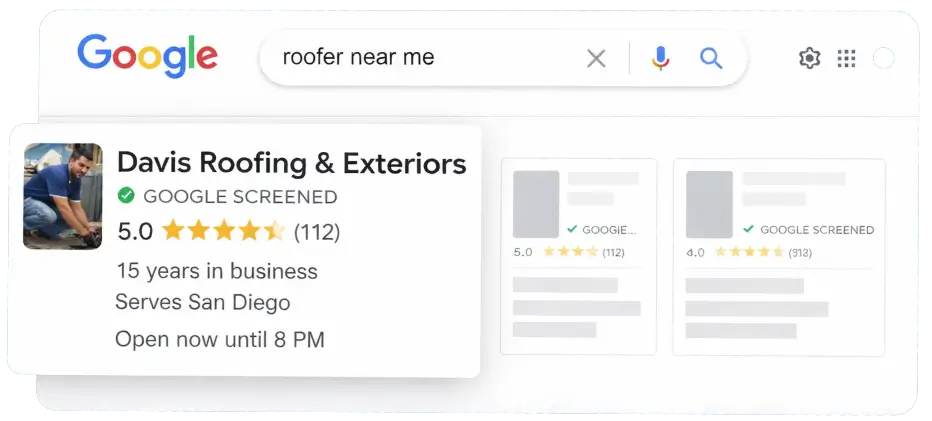 LSAs put your roofing company at the very top of Google. Above everything. You only pay when someone actually calls you. Not clicks. Calls. Google checks your license, insurance, and runs background checks so homeowners know you are legit before they ever pick up the phone.